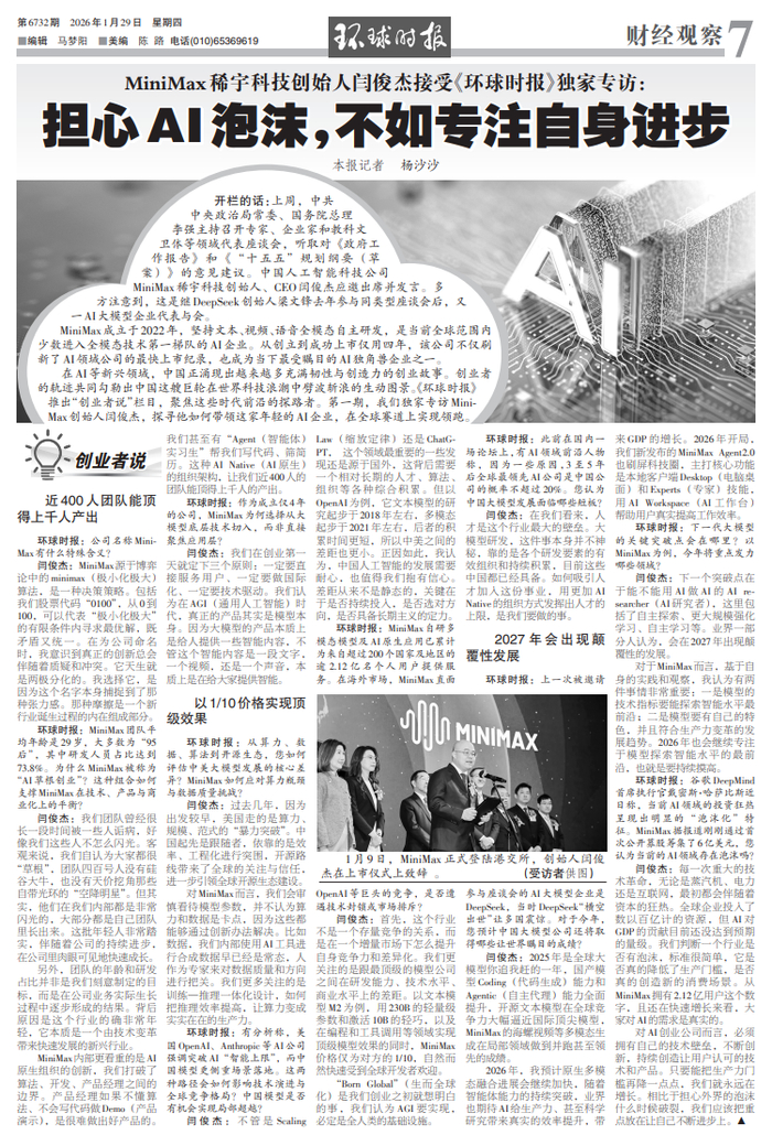 环球时报:作为成立仅4年的公司,MiniMax为何选择从大模型底层技术切入,而非直接聚焦应用层?